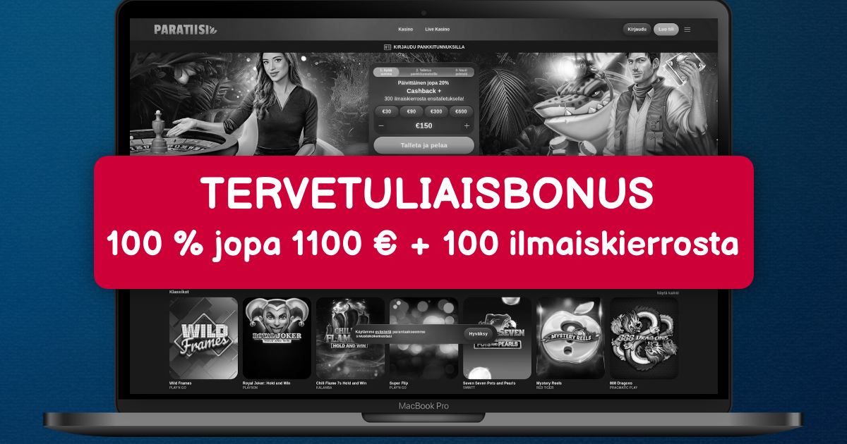 Paratiisi Kasino on Suomen johtava online-kasino, joka tarjoaa pelaajille erinomaisen pelikokemuksen luotettavasti ja turvallisesti. Uudet pelaajat saavat upean 500€ tervetuliaistarjouksen ensimmäisellä talletuksellaan kierrätysvaatimuksella 35x. Kasinomme toimii Curacaon lisenssin alaisuudessa ja tarjoaa pelaajille nopeat kotiutukset, usein jo 24 tunnin sisällä. Meiltä löydät laajan valikoiman pelejä, mukaan lukien yli 2000 kolikkopeliä, jännittävät live-kasinopelit ja klassiset pöytäpelit. Pelivalikoimassamme on huippulaatuisia pelejä johtavilta pelinkehittäjiltä kuten NetEnt, Pragmatic Play ja Evolution Gaming. Paratiisi Kasino on täysin optimoitu mobiililaitteille, joten voit nauttia suosikkipeleistäsi missä tahansa. Talletukset ja nostot onnistuvat helposti Trustly:n, Skrill:n ja perinteisten pankkisiirtojen kautta. Asiakaspalvelumme palvelee sinua ympäri vuorokauden suomeksi.
